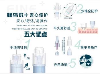 本次博览会上贝普还重磅发布了新品全新一代防针刺胰岛素针——蜂鸟优+,既延续了蜂鸟针不折不漏硬针尖的特点,还在此基础上安心防针刺。其中手动防针刺、双端防护功能让针尖在使用中和使用后360度防护。贝普专利的平头设计极大减轻了患者在注射时候的不舒适感,去除了小针帽的设计让使用步骤减少,方便了不少中老年患者。而目前市售最细的34G针尖让胰岛素的注射真正的做到了入肉几乎无感。