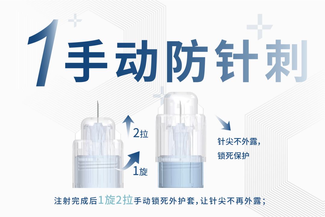 手动防针刺:注射完成后1旋2拉手动锁紧外护套,让针尖不再外露。