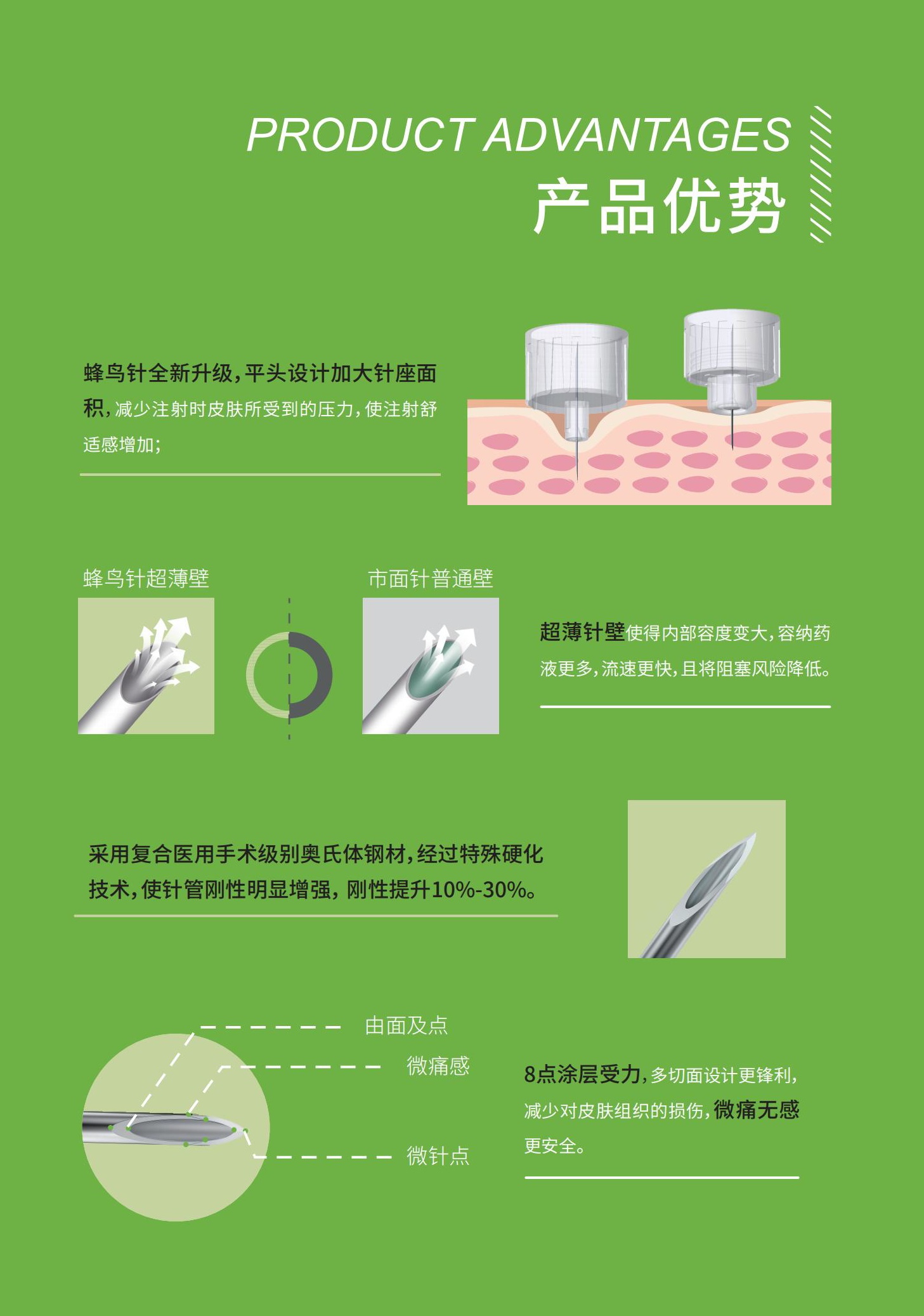 - 安全度:蜂鸟针表面进行多重抛面光滑,以排汗路径进入人体,尽可能减少对皮肤组织的损伤;